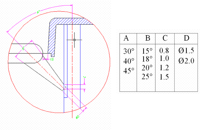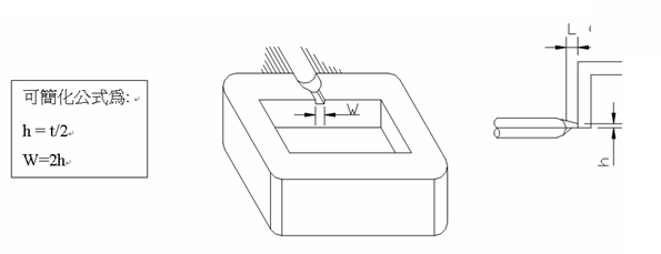 適用于大部塑料、各種側(cè)邊允許澆口痕跡的制品,開(kāi)在制品的邊緣或邊緣頂面,又分標(biāo)準(zhǔn)入水、搭接入水和扇形入水,下圖中t為產(chǎn)品壁厚,L一般為(0.8—1mm)