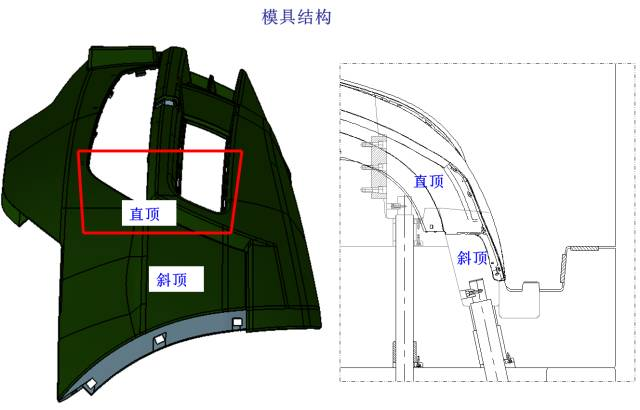 如下圖所示,產(chǎn)品兩頭采用直頂+斜頂?shù)臋C構(gòu)進(jìn)行脫模。
