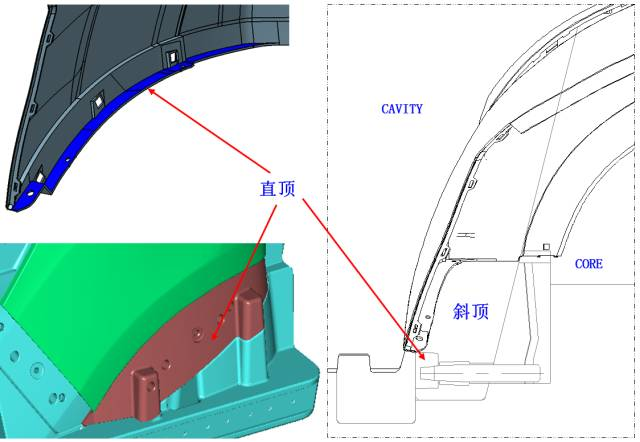 扣位采用在直頂上做隧道彈塊的結(jié)構(gòu)進(jìn)行脫模: