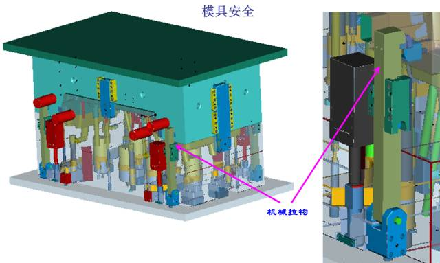 為了保證開模時斜頂跟前模一起同步運動,以使產(chǎn)品變形而脫模,當(dāng)頂出機構(gòu)同前模同步運動60MM后, 前/后模部分分離,這樣保護(hù)了模具,也保證了產(chǎn)品不會被拖傷!