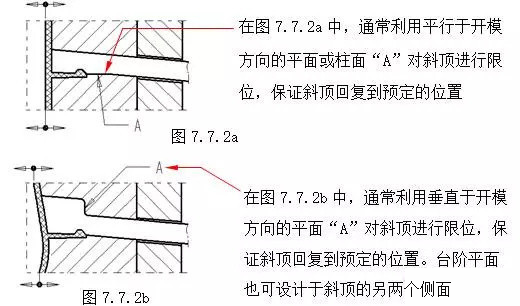 在斜頂機(jī)構(gòu)中,為了保證斜頂工作穩(wěn)定、可靠,應(yīng)該注意以下幾點(diǎn):(A)斜頂?shù)膭傂?。增?qiáng)斜頂剛性一般采用:1.在結(jié)構(gòu)允許的情況下,盡量加大斜頂橫斷面尺寸。(參見第七章7.2節(jié))2.在可以滿足側(cè)向出模的情況下,斜頂?shù)男倍冉恰癆”盡量選用較小角度,斜角A一般不大于20°,并且將斜頂?shù)膫?cè)向受力點(diǎn)下移,如增加圖7.7.1a中的鑲塊2,同時(shí)鑲塊可以具有較高的硬度,提高 模具 的壽命。(B)斜頂橫向移動(dòng)空間。如圖7.7.1a所示尺寸“D”,為了保證斜頂在頂出時(shí)不與膠件上的其它結(jié)構(gòu)發(fā)生干涉,應(yīng)充分考慮斜頂?shù)膫?cè)向分模距離、斜頂?shù)男倍冉恰癆”,以保證有足夠的橫向移動(dòng)空間“D”。(C)斜頂在開模方向的復(fù)位。為了保證合模后,斜頂回復(fù)到預(yù)定的位置,一般采用下面的結(jié)構(gòu)形式。如圖7.7.2a;7.7.2b。